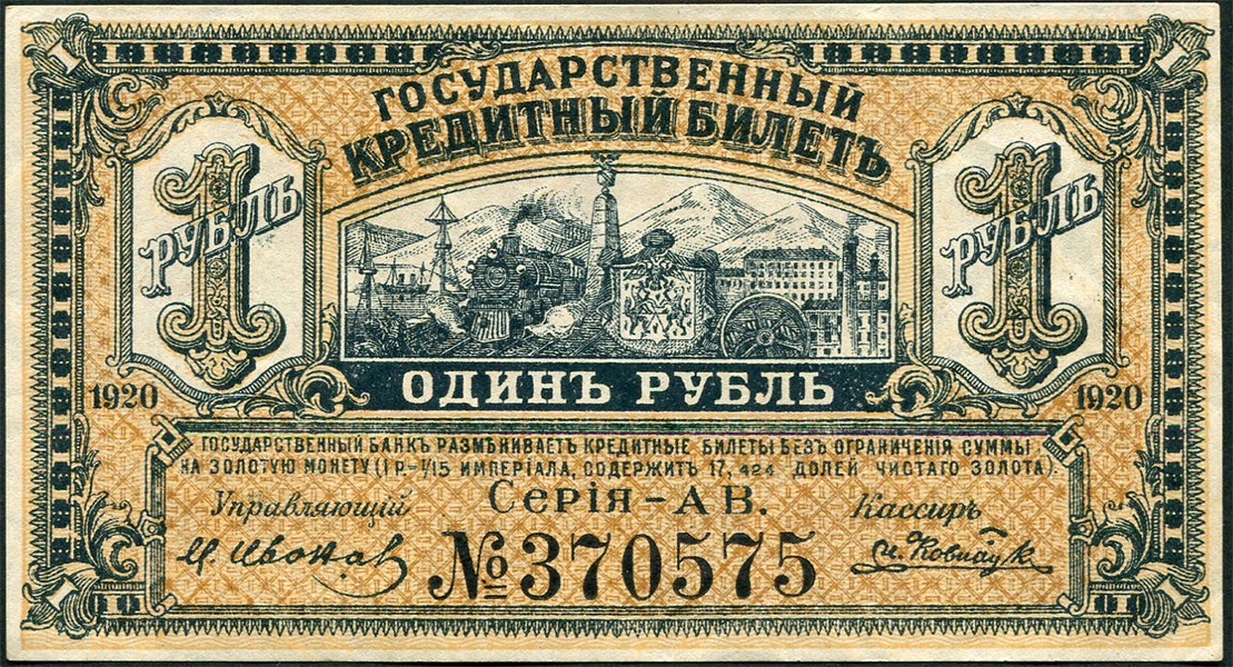 Временное Правительство Дальнего Востока (Правительство А.С. Медведева). Государственный кредитный билет номиналом 1 рубль образца 1920 г., АВ 370575. Управляющий М. Иванов, Кассир И. Ковнацкий.