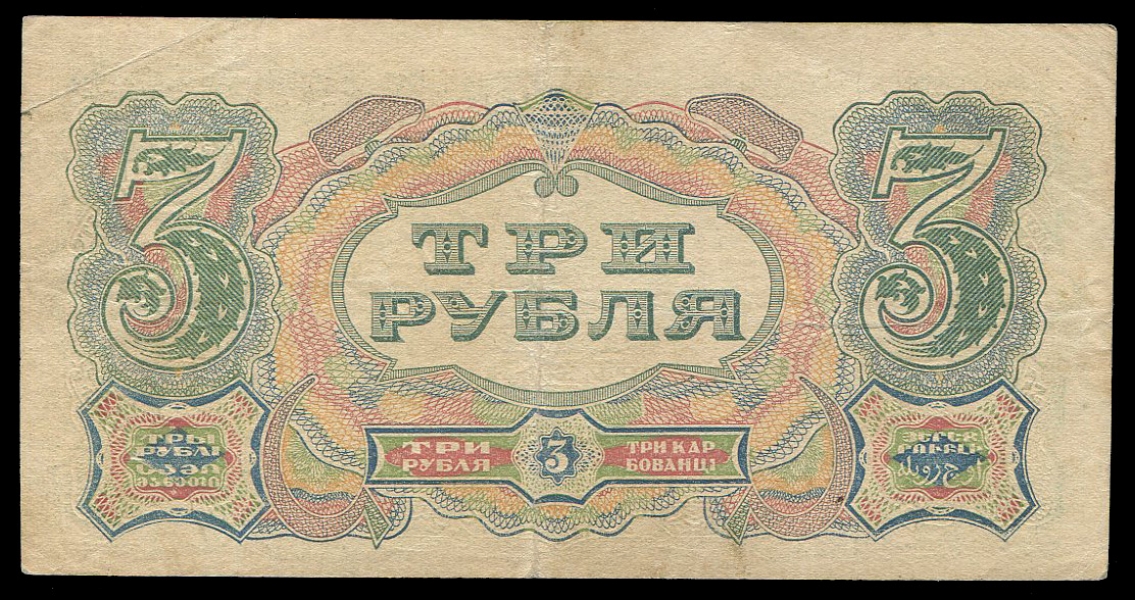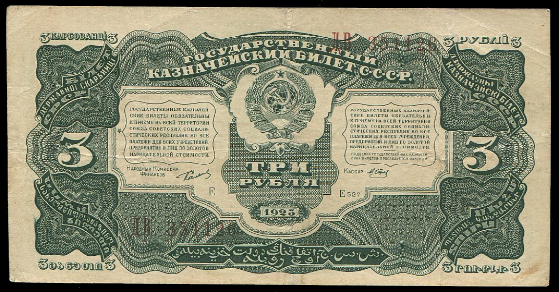 Государственный казначейский билет СССР 3 рубля 1925 г., ДВ 351126. Кассир М. Отрезов, литера Е.