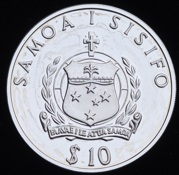 Легенда аверса "SAMOA I SISIFO". Легенда на гербе "FAAVAE I LE ATUA SAMOA" (Самоа создано богом).