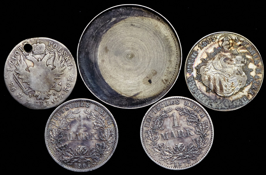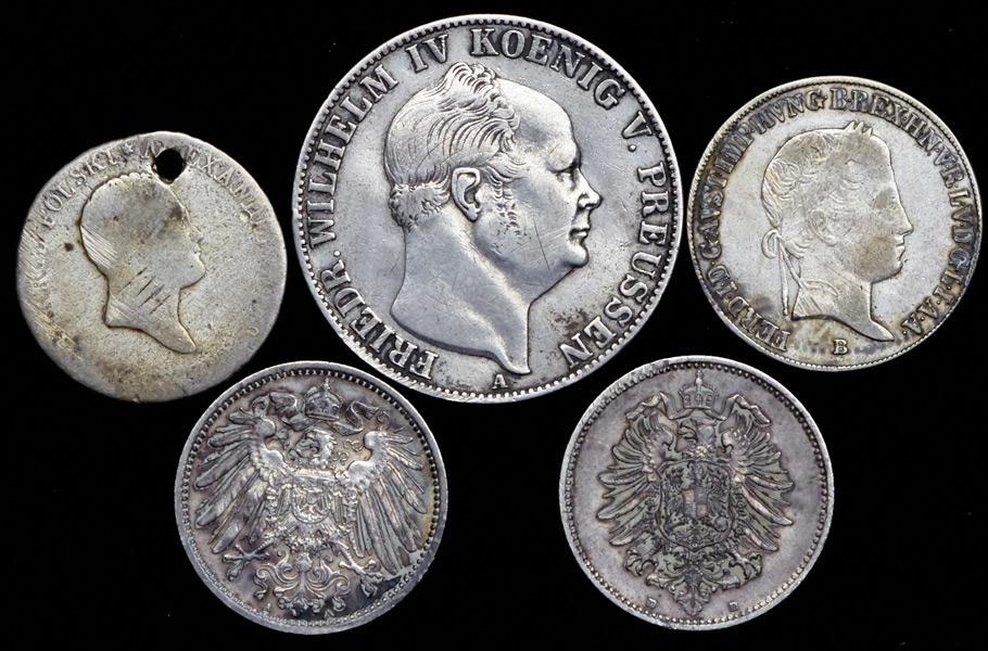 Набор из 5-ти серебрянных монет стран Европы, в т.ч. талер с выточкой.