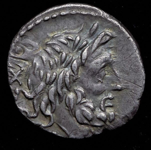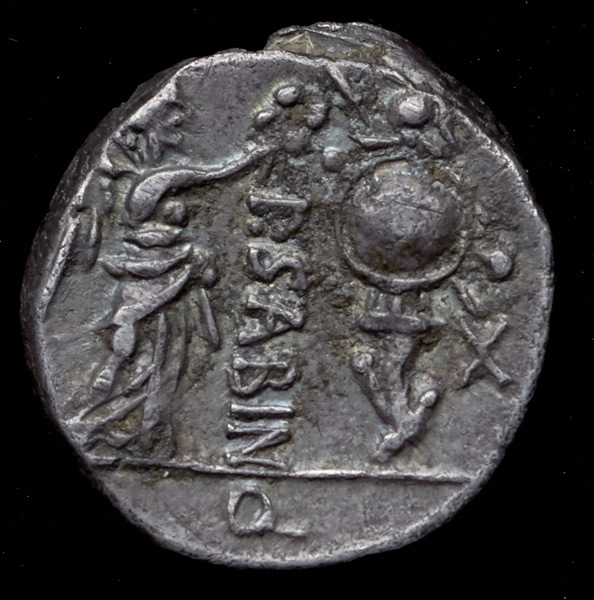 На аверсе этой древнеримской монеты изображена голова Юпитера в диадеме, повёрнутая вправо, за головой Х. На реверсе вертикально "P SABIN", Виктория, стоящая вправо, возлагает венок на трофей, за трофеем Х, под обрезом Q.