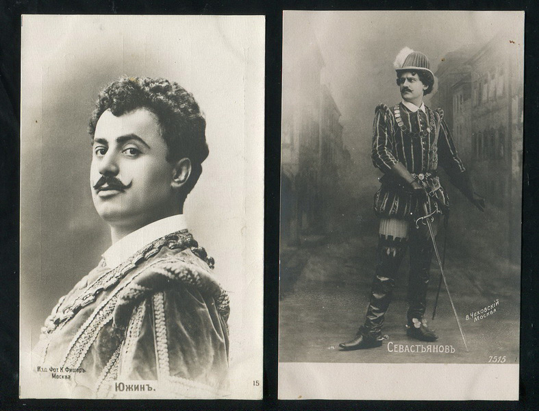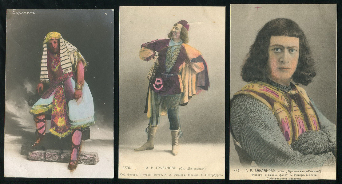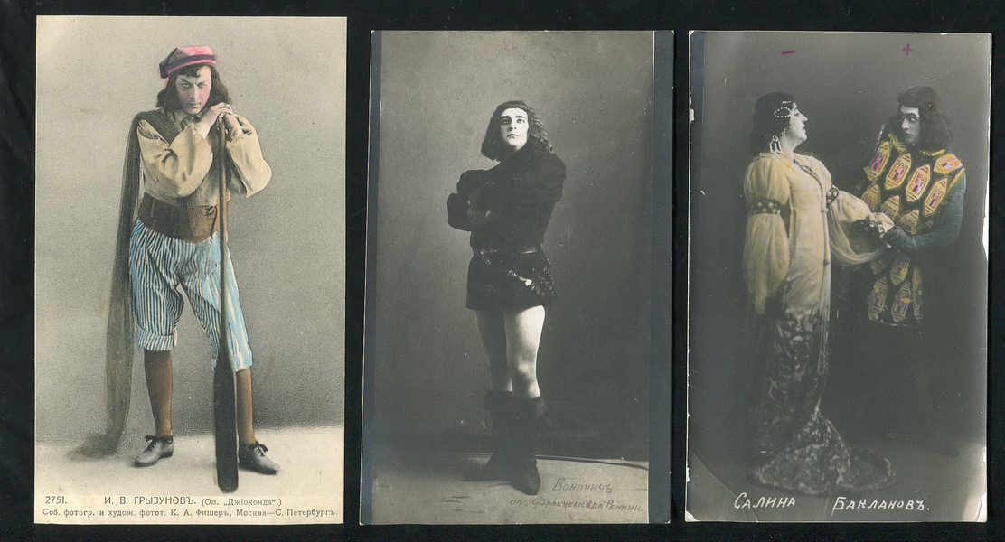 В набор вошли дореволюционные фото-открытки с артистами опер "Франческа-ди-Римини" и "Джоконда": Бакланов, Грызунов, Боначич, Силина, Севастьянов, Южин.