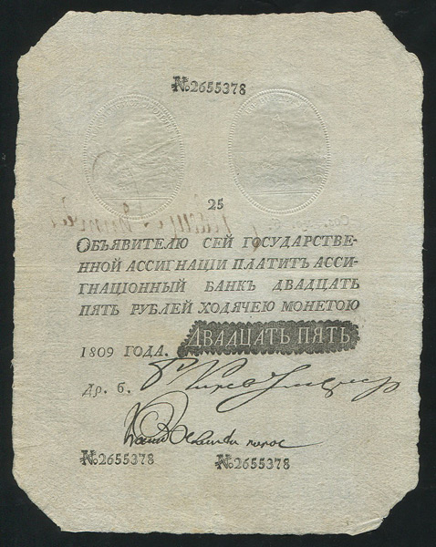 Государственная ассигнация 25 рублей 1809 года, №2655378. "Наполеоновская" подделка.