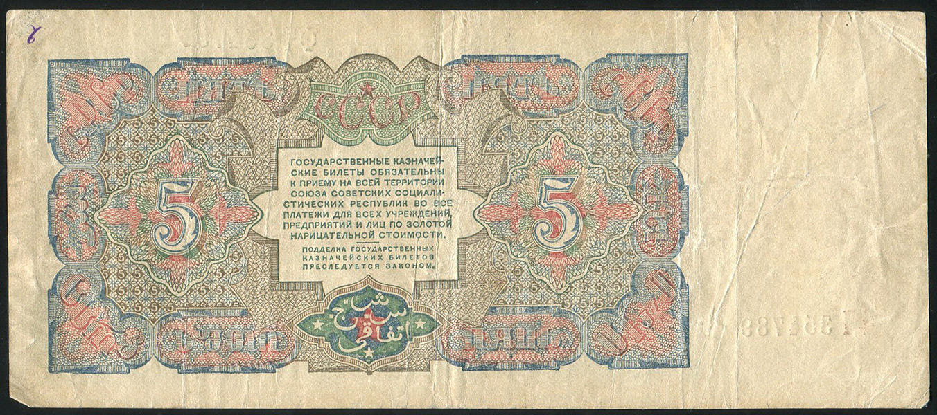 Государственный казначейский билет СССР 5 рублей образца 1925 года, фЧ 354789. Кассир Павлов.