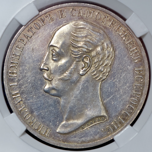 Чеканен по случаю открытия памятника императору Николаю I в Санкт-Петербурге. В обрезе шеи "А.ЛЯЛИН". Выпуклый чекан.