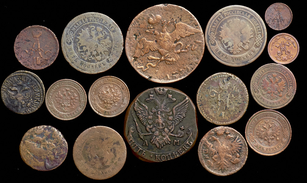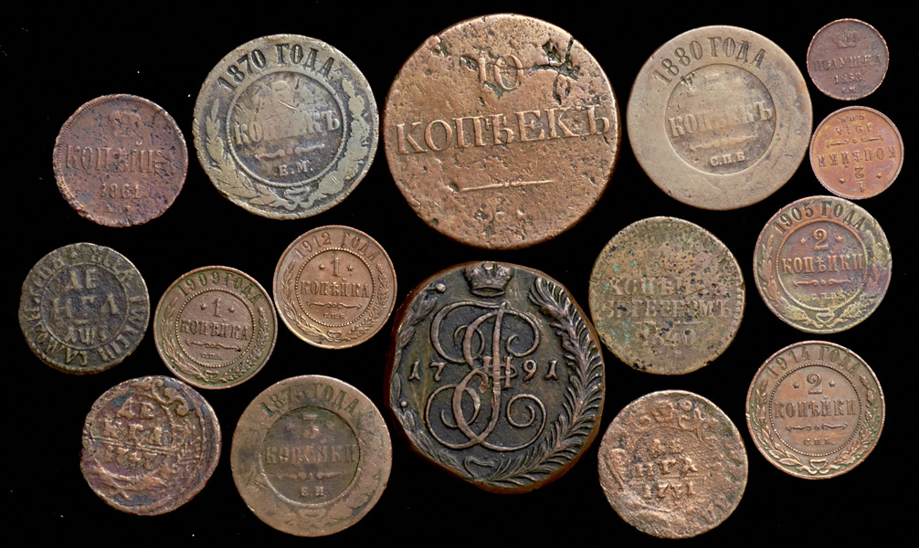 В набор вошли монеты от времен правления Петра I до Николая II. Сохранность G-XF.