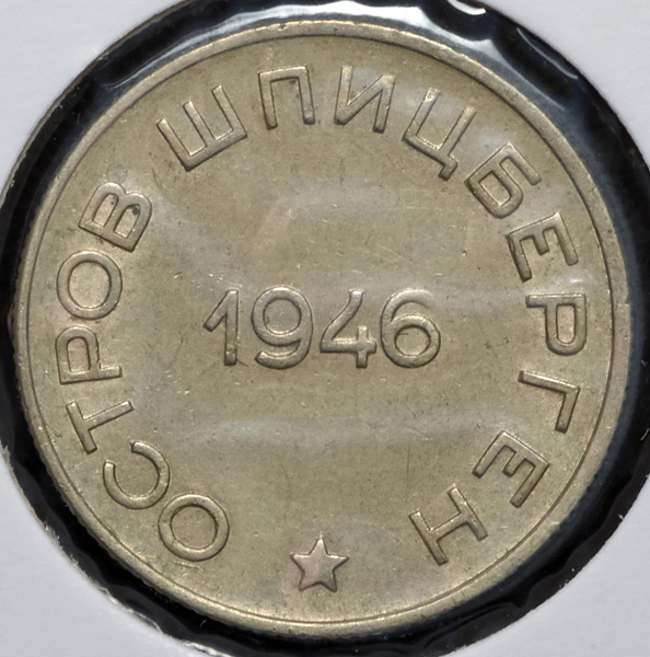 Остров Шпицберген является территорией Норвегии с 1920 г. и представляет собой группу островов в Северном Ледовитом Океане. В 1932 г. Советское правительство в качестве концессии получило в аренду угольные шахты в деревнях Баренцбург и Пирамида и российская угледобывающая компания Арктикуголь начала свою деятельность на этих островах. В 1946 г. Ленинградский монетный двор отчеканил монеты (жетоны) 4-х разновидностей: номиналом 10 и 15 копеек (из сплава алюминия и бронзы), 20 и 50 копеек (из медно-никелиевого сплава). Более того, существуют две разновидности монет номиналом 50 копеек: с маленькой звездой и с большой звездой.
