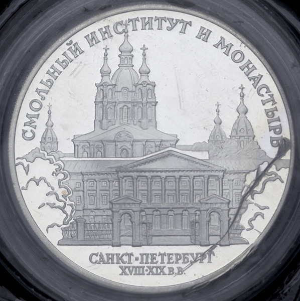 На реверсе этой серебряной монеты изображение Смольного института и монастыря в г. Санкт-Петербурге и надписи: по окружности вверху - "СМОЛЬНЫЙ ИНСТИТУТ И МОНАСТЫРЬ", внизу - "САНКТ-ПЕТЕРБУРГ", ниже - даты "XVIII * XX".
