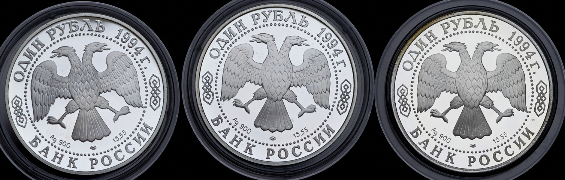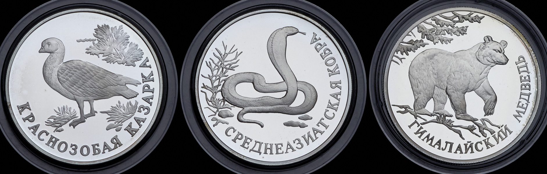 Полный комплект монет номиналом 1 рубль из серии "Красная книга", выпущенных в 1994 году из серебра: Гималайский медведь, Среднеазиатская кобра, Краснозобая казарка.