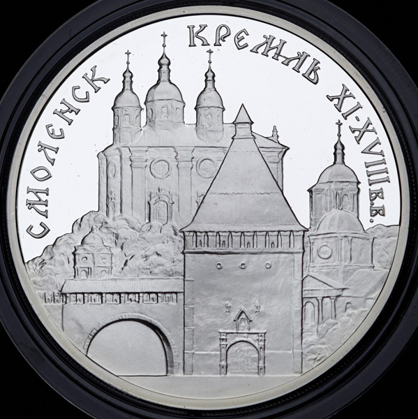 На реверсе монеты изображение архитектурных памятников Смоленского Кремля, вверху по окружности - надпись: "СМОЛЕНСК КРЕМЛЬ XI-XVIII в.в."