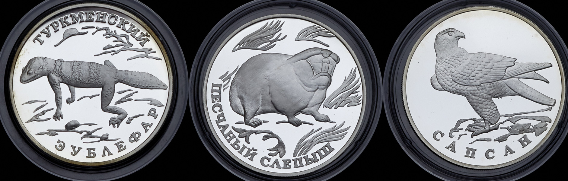 Полный комплект монет номиналом 1 рубль из серии "Красная книга", выпущенных в 1996 году из серебра: Сапсан, Песчаный слепыш, Туркменский эублефар.