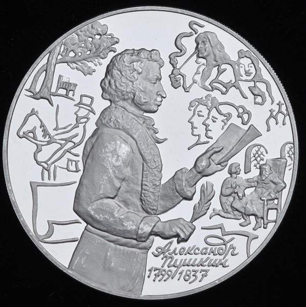 На реверсе портрет А.С.Пушкина с тетрадью и пером в руках, на втором плане справа — персонажи произведений Пушкина («Арап Петра Великого», «Борис Годунов»), два женских профиля (рисунок Пушкина), очертания оконных проёмов и церковных куполов, слева — «скамья Онегина» в Тригорском и всадник (рисунок Пушкина), ниже — рукопись. Внизу — надпись: «АЛЕКСАНДР ПУШКИН» и даты «1799» «1837».