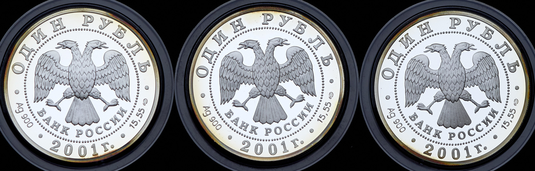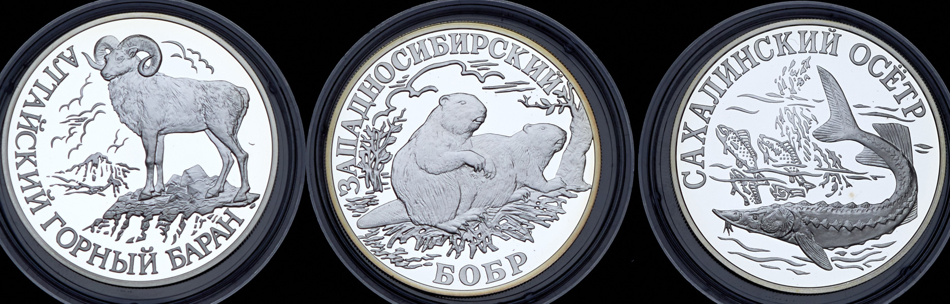 Полный комплект монет номиналом 1 рубль из серии "Красная книга", выпущенных в 2001 году из серебра: Сахалинский Осётр, Алтайский Горный Баран, Хападносибирский Бобр.