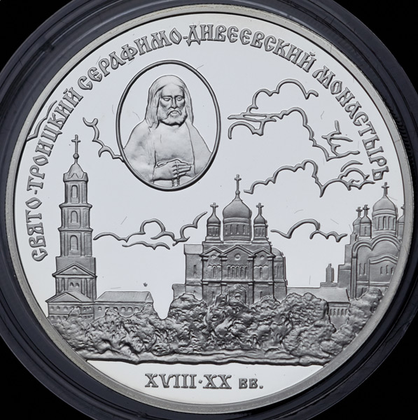 На реверсе изображение панорамы памятников Свято-Троицкого Серафимо-Дивеевского монастыря, над ним слева в овале - прижизненное изображение преподобного Серафима Саровского, вверху по окружности - надпись: "СВЯТО-ТРОИЦКИЙ СЕРАФИМО-ДИВЕЕВСКИЙ МОНАСТЫРЬ", внизу - даты "XVIII - XX вв."