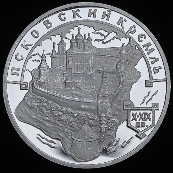 На реверсе изображения Троицкого собора (XII в.), крепостных стен и башен (XIV - XV вв.) Псковского кремля на берегу реки, вверху по окружности - надпись: "ПСКОВСКИЙ КРЕМЛЬ", справа внизу в стилизованной рамке - дата в две строки "X-XIX вв."
