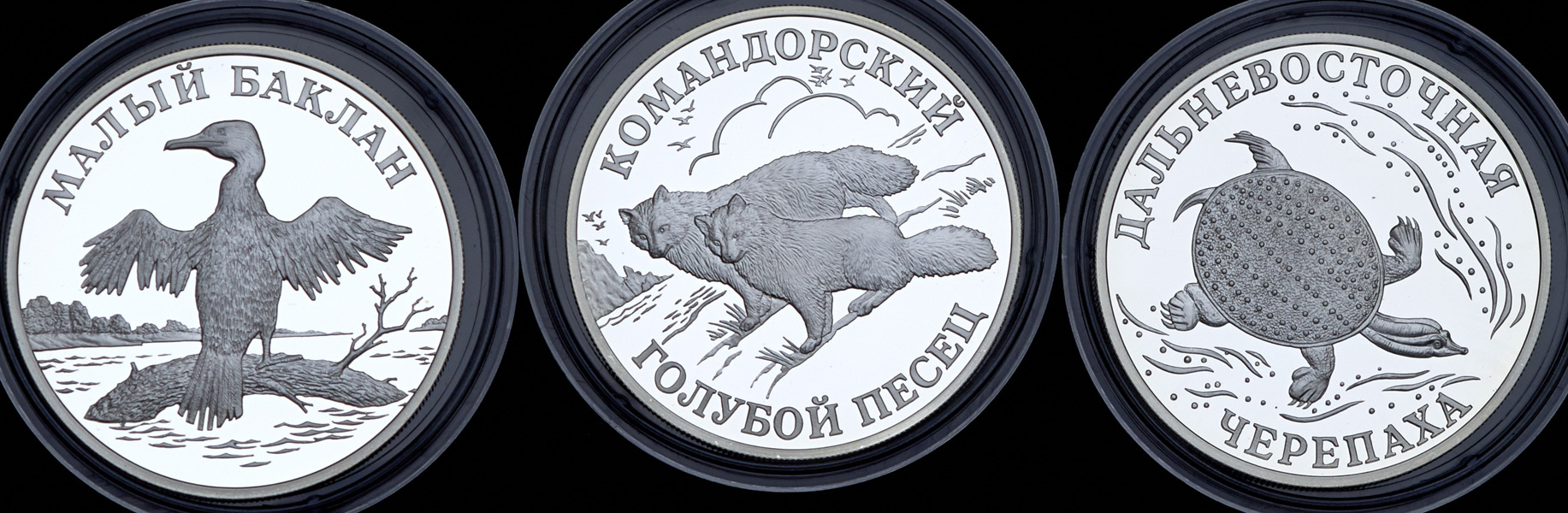 Полный комплект монет номиналом 1 рубль из серии "Красная книга", выпущенных в 2003 году из серебра: Малый Баклан,Дальневосточная черепаха, Командорский Голубой Песец.