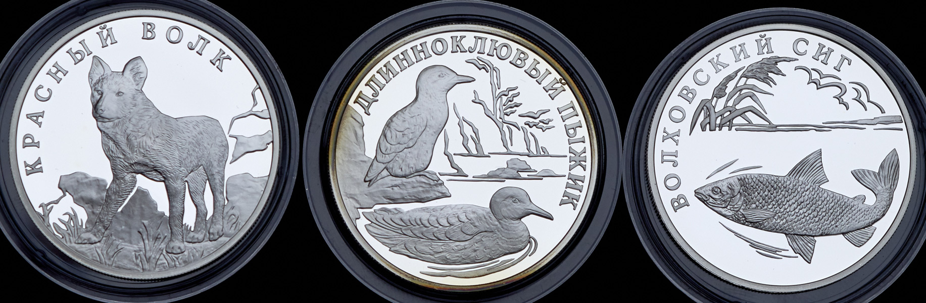 Полный комплект монет номиналом 1 рубль из серии "Красная книга", выпущенных в 2005 году из серебра: Красный волк, Длинноклювый пыжик, Волховский сиг.