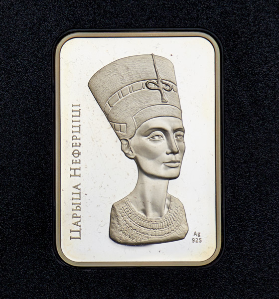 На реверсе в центре – рельефное изображение скульптурного портрета царицы Нефертити; слева надпись: Царыца Неферціці; справа внизу – проба сплава.