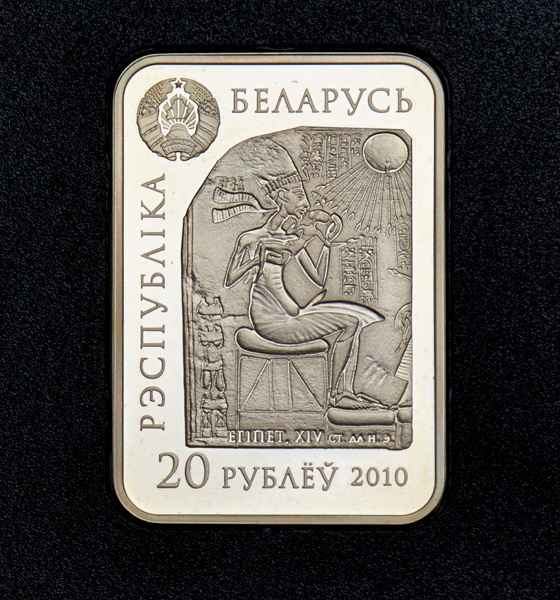На аверсе вверху слева – рельефное изображение Государственного герба Республики Беларусь; в центре – рельефное изображение фараона Аменхотепа IV (Эхнатона) с женой, царицей Нефертити; легенда: слева – РЭСПУБЛІКА, вверху – БЕЛАРУСЬ; внизу – год чеканки и номинал 20 РУБЛЁЎ.