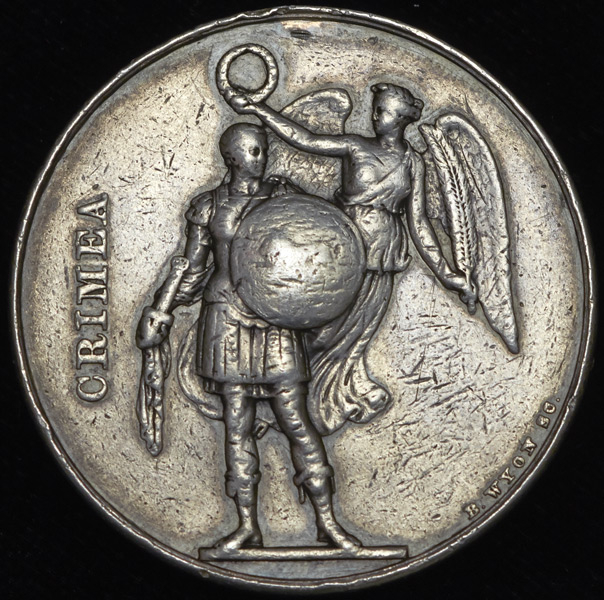 На лицевой стороне медали помещен увенчанный диадемой бюст Королевы Виктории в окружении по бокам надписи «Victoria Regina», указанием имени дизайнера «В. WYON РА» на нижнем срезе бюста и помещенной под ним датой «1854». На оборотной стороне изображен воин в римской одежде с круглым щитом и коротким мечом в руках, венчаемый лавровым венком в руках парящей позади и слева от него Богиней победы Викторией, расположенными на 9 часов по вертикали надписью «Crimea» (Крым) и указанием имени дизайнера «B. WYON SC» на 4 часа. Известен также условно т.н. второй тип медали, на котором указание имени дизайнера на реверсе отсутствует. Уникальность дизайна медали состоит в никогда более не использовавшихся в британских наградах формах подвески и части шарнира (выполненных в виде пальмового венка и элемента цветочной растительности) и учрежденных в разное время памятных боевых, пристегиваемых к медали планок из серебра (выполненных в виде дубового листа в обрамлении веточек с желудями на концах) Лента медали шириной 28 мм, светло-голубого цвета с желтыми полосами по краям, шириной 3 мм каждая.