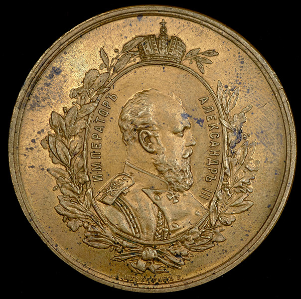 На аверсе под короной внутри венка овал с бюстом Александра III вправо в мундире, вокруг надпись "ИМПЕРАТОРЪ - АЛЕКСАНДРЪ III. Внизу подпись "Л. ШТЕИНМАНЪ Р. (Л. Штейнман резал).