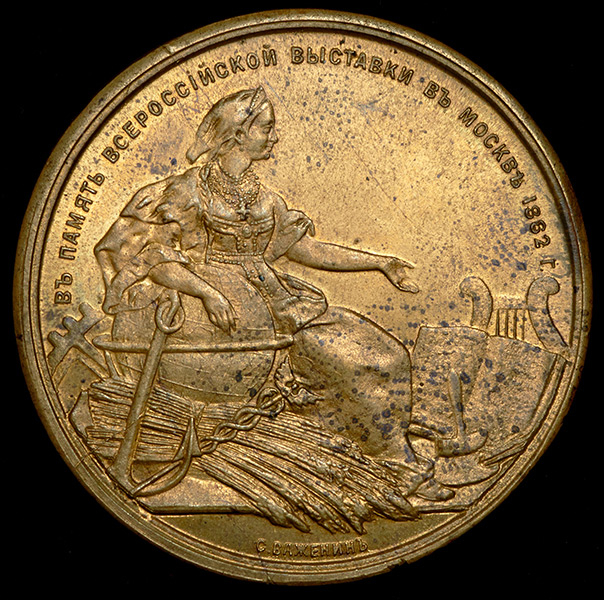 На реверсе сидящая женщина в русской одежде облокачивается на глобус, рядом на земле атрибуты наук, промышленности и искусств. Внизу подпись "С. ВАЖЕНИНЪ".
