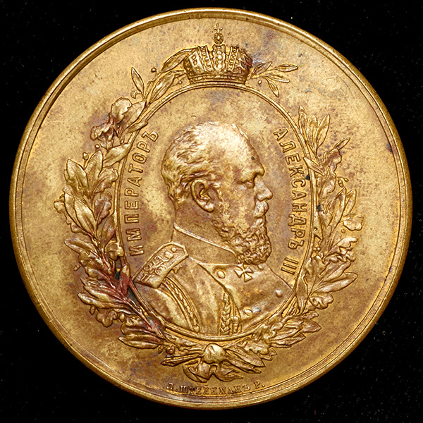 На аверсе под короной внутри венка овал с бюстом Александра III вправо в мундире, вокруг надпись "ИМПЕРАТОРЪ - АЛЕКСАНДРЪ III. Внизу подпись "Л. ШТЕИНМАНЪ Р. (Л. Штейнман резал).