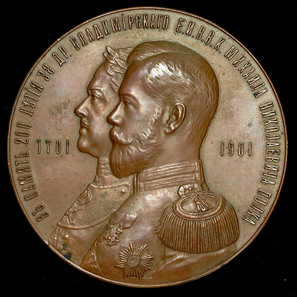 На аверсе изображены обращенные влево погрудные портреты Императоров Николая II и Петра I, в военных мундирах, с орденами и медалями на груди, на обрезе плеча Николая подпись "ГРИЛИХ . СЫНЪ Р ."(Грилихес-сын резал). По сторонам от портретов даты "1701-1901".