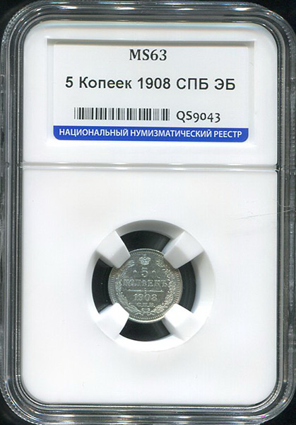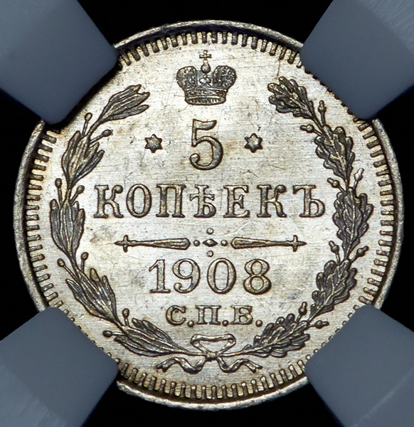 5 копеек 1908 (в слабе) СПБ-ЭБ
