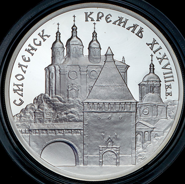 На реверсе монеты изображение архитектурных памятников Смоленского Кремля, вверху по окружности - надпись: "СМОЛЕНСК КРЕМЛЬ XI-XVIII в.в."
