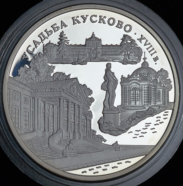 На реверсе изображение памятников архитектуры усадьбы Кусково: слева — дворец, справа — белокаменная скульптура и павильон «Грот», на втором плане — павильон «Оранжерея». Вверху по окружности надпись: «УСАДЬБА КУСКОВО» и дата «XVIII в.».