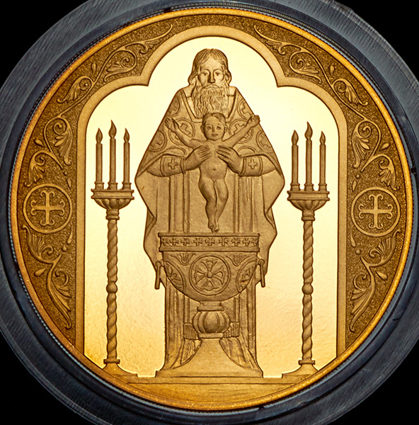 Медаль изготовлена по заказу Игоря Витальевича Руденко (известный российский коллекционер, нумизмат, автор нескольких каталогов, посвященных жетонам) в честь крещения его сына.
