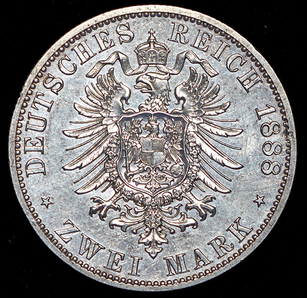 Легенда реверса: "DEUTSCHES REICH 1888 ZWEI MARK".