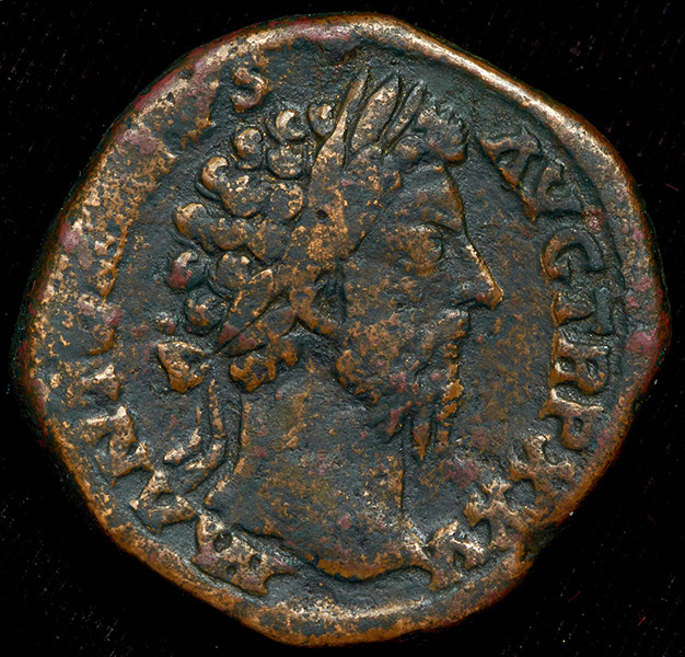 Легенда аверса: M(arcus) ANTONINVS AVG(ustus) TR(ibunicia) P(otestas) XXV (Марк Антонин Август Народный Трибун 25 раз).