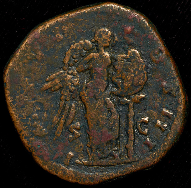 Легенда реверса: IMP(erator) VI CO(n)S(ul) III / S(enatus) C(onsulto)(Император 6 раз Консул 3 раз / Повеление Сената).