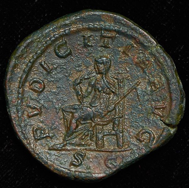 Легенда реверса: PVDICITIA AVG (Целомудрие Августы). Персонификация Стыдливости, сидящая на троне влево, правой рукой прикрывает лицо краем покрывала, в левой руке держит скипетр.