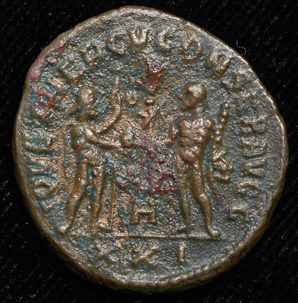 Легенда реверса: IOV ET HERCV CONSER AVGG (Iovi et Herculi Conservatori Augustorum) (Юпитер и Геркулес защитники Августа). Под обрезом: XXI.