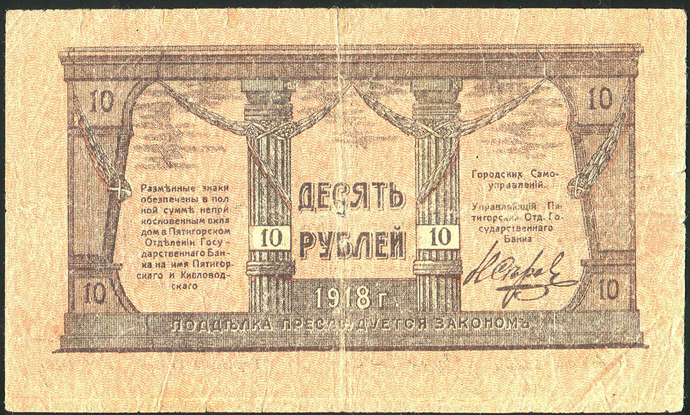 Разменный знак минераловодского городского самоуправления 10 рублей 1918 года, В-11