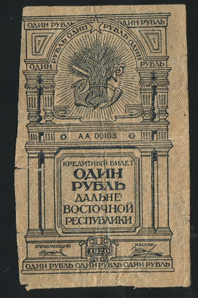 Кредитный билет Дальневосточной республики 1 рубль 1920 года, АА 00103.