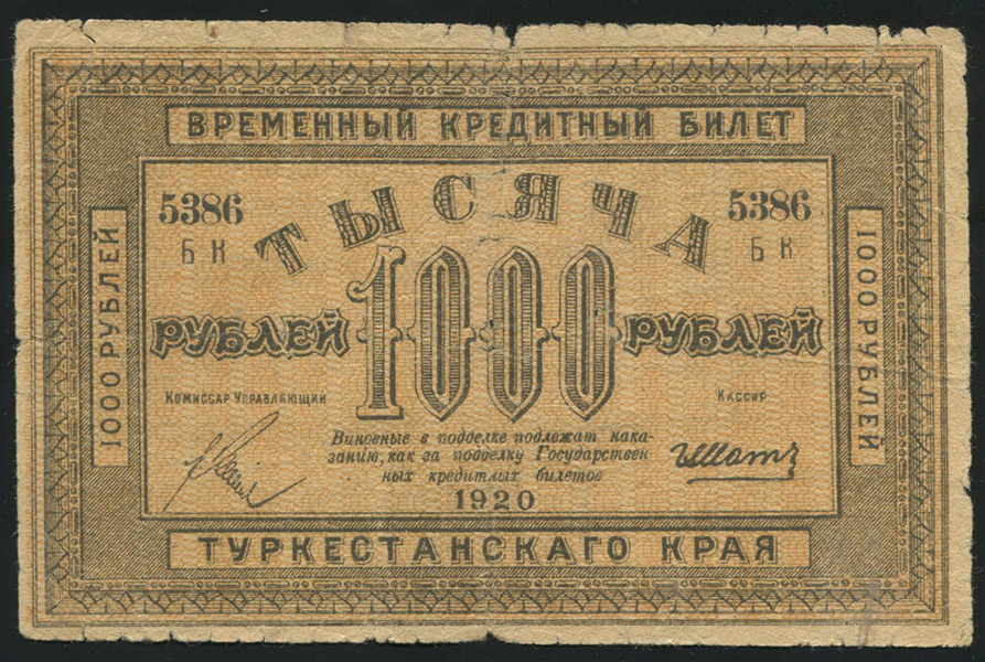 Временный Кредитный билет Туркестанского края 1000 рублей 1920 года, БК 5386. Без водяных знаков.
