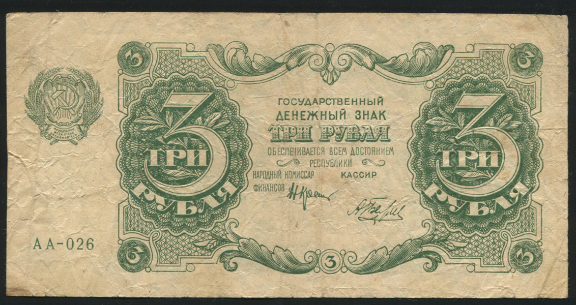 Государственный денежный знак 3 рубля образца 1922 года, АА-026. Кассир Беляев.
