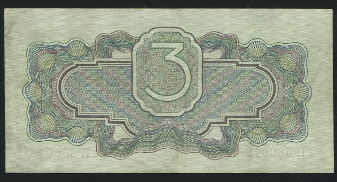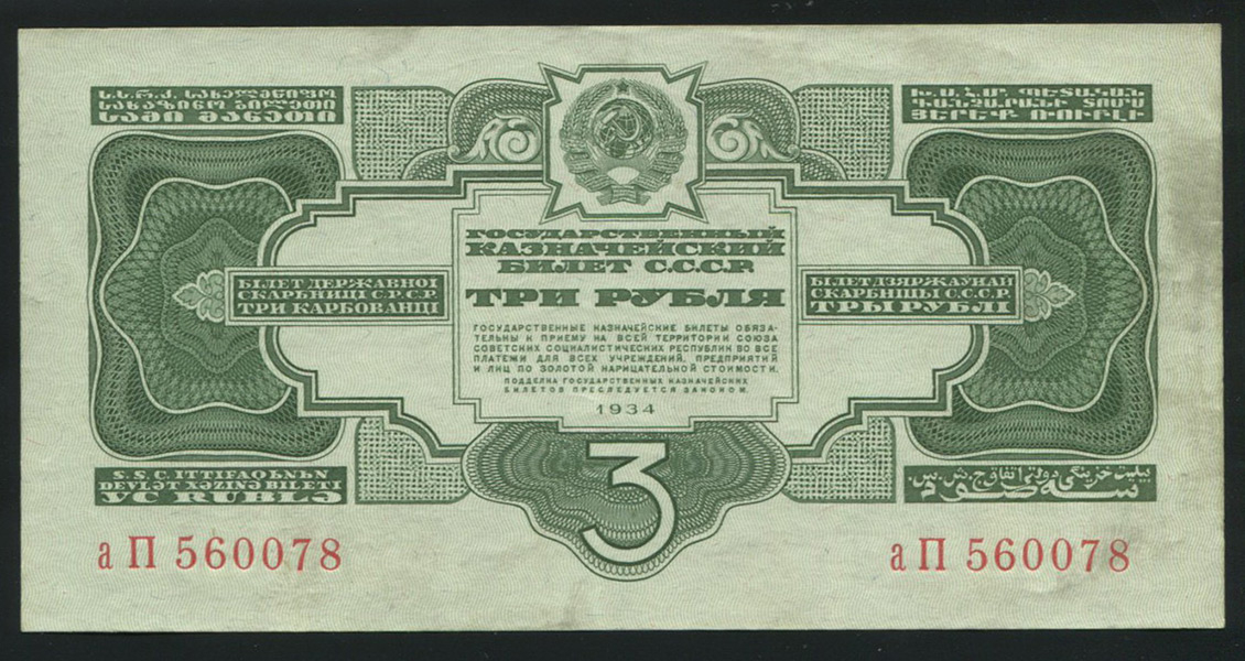Государственный казначейский билет СССР образца 1934 года 3 рубля, аП 560078. 2-й выпуск (без подписи наркома финансов).