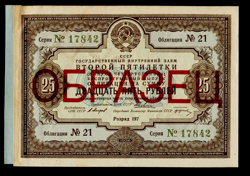 Государственный Внутренний Заем Второй Пятилетки (Выпуск четвертого года) беспроигрышный выпуск. Облигация 25 рублей 1936 года, Серия № 17842, Облигация № 21, Разряд 197. "Образец". На обеих сторонах облигации красной типографской краской нанесено слово "Образец". Редка.