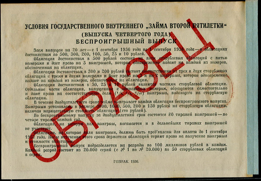 Облигация Займа Второй пятилетки 25 рублей 1936. ОБРАЗЕЦ