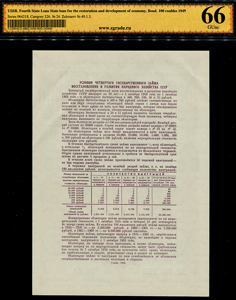 Четвертый государственный заем восстановления и развития народного хозяйства СССР, Облигация №24 1949 года на сумму 100 рублей. Серия №064218. Разряд 226. В слабе ZG GUnc 66 / 10.