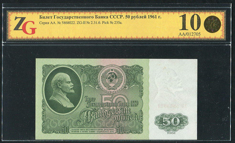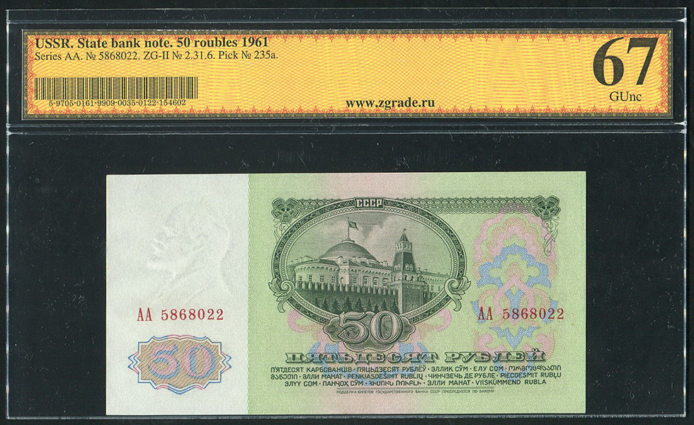 Билет Государственного Банка СССР 50 рублей образца 1961 года, АА 5868022. В слабе ZG GUnc 67.