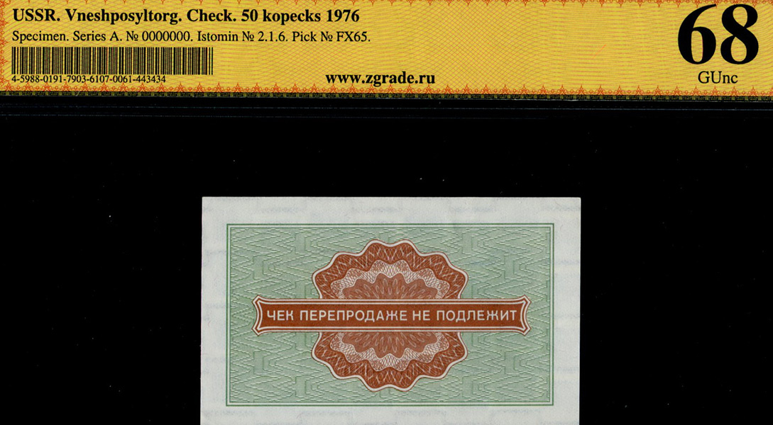 Чек "Внешпосылторг" 50 копеек 1976. ОБРАЗЕЦ (в слабе)