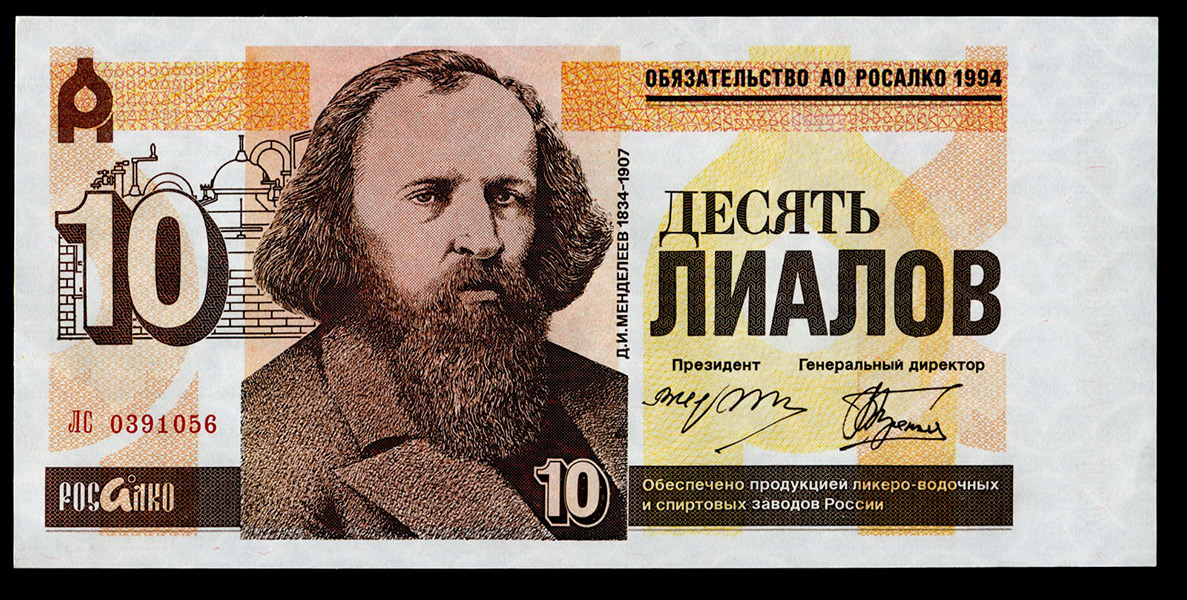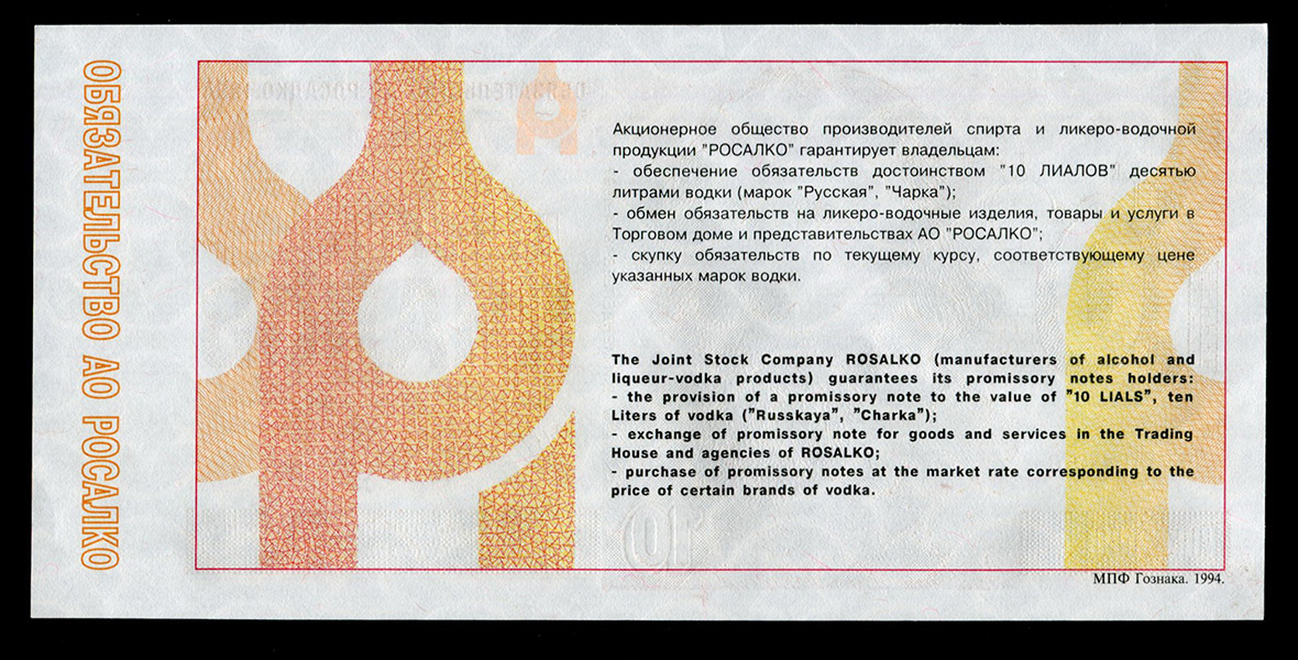 Российская Федерация, АО РОСАЛКО, обязательство 10 лиалов (литров алкоголя) 1994 г., ЛС 0391056.
