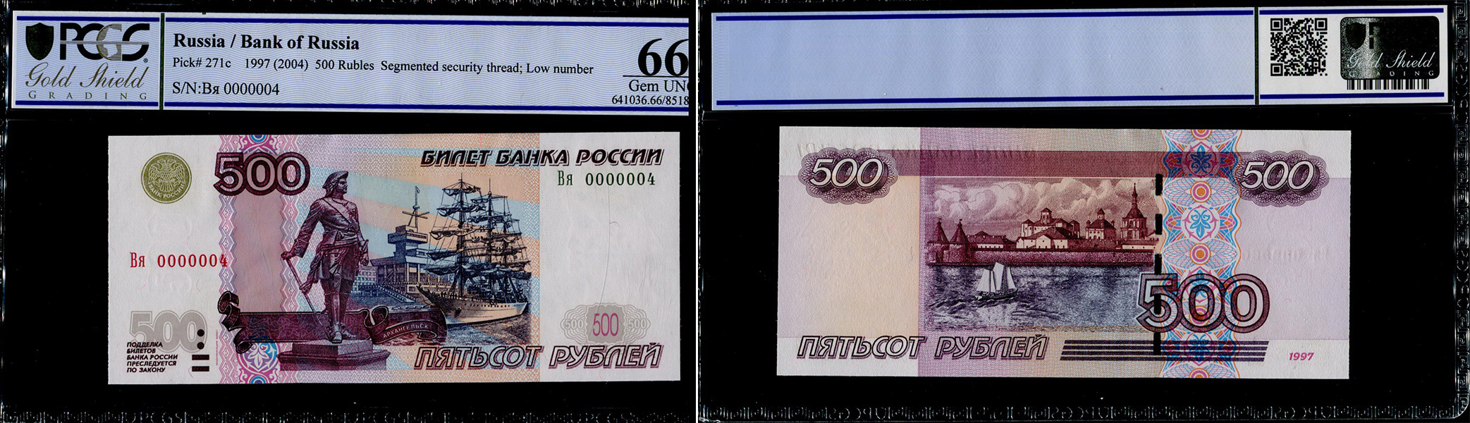 - 500 рублей образца 1997 года, Вя 0000004, в слабе PCGS Gem UNC 66;