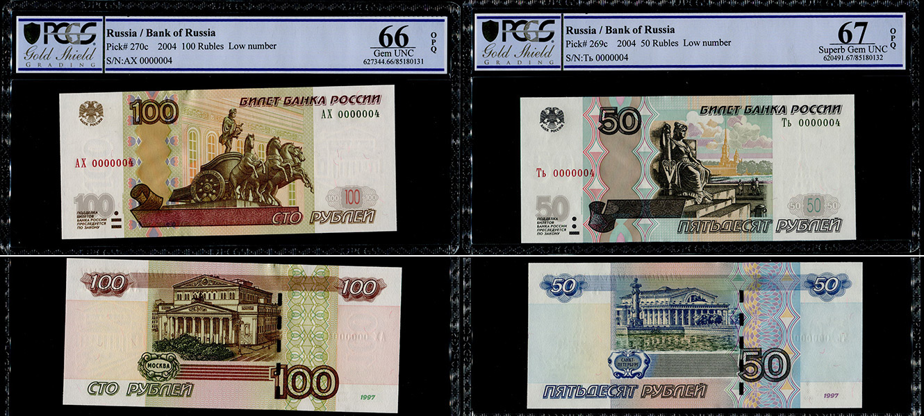 - 50 рублей образца 1997 года, Ть 0000004, в слабе PCGS Superb Gem UNC 67;
